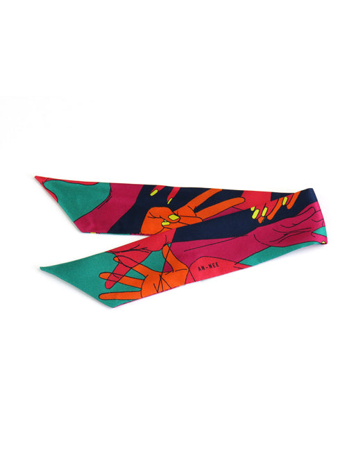 Grosses, 4 cm breites Seidenarmband mit einem "Handspiele"-Muster in leuchtenden Farben mit einem Grünstich. Dieses Armband ist mit den separat erhältlichen Sanduhr- und Seil-Schalringen sowie der grossen Manschette kompatibel. Das Armband sieht auch toll aus, wenn es ohne Accessoires getragen und einfach um das Handgelenk gebunden wird.