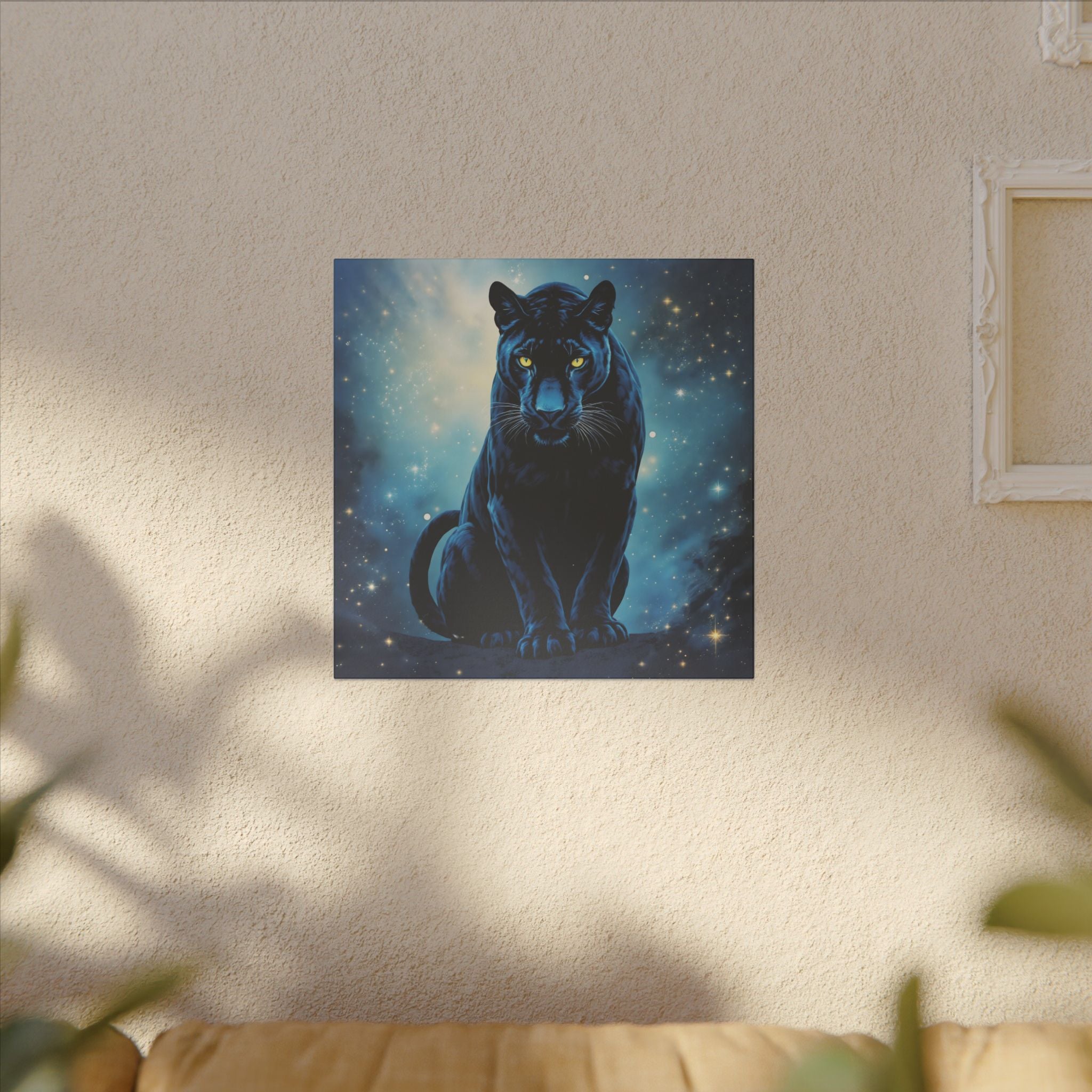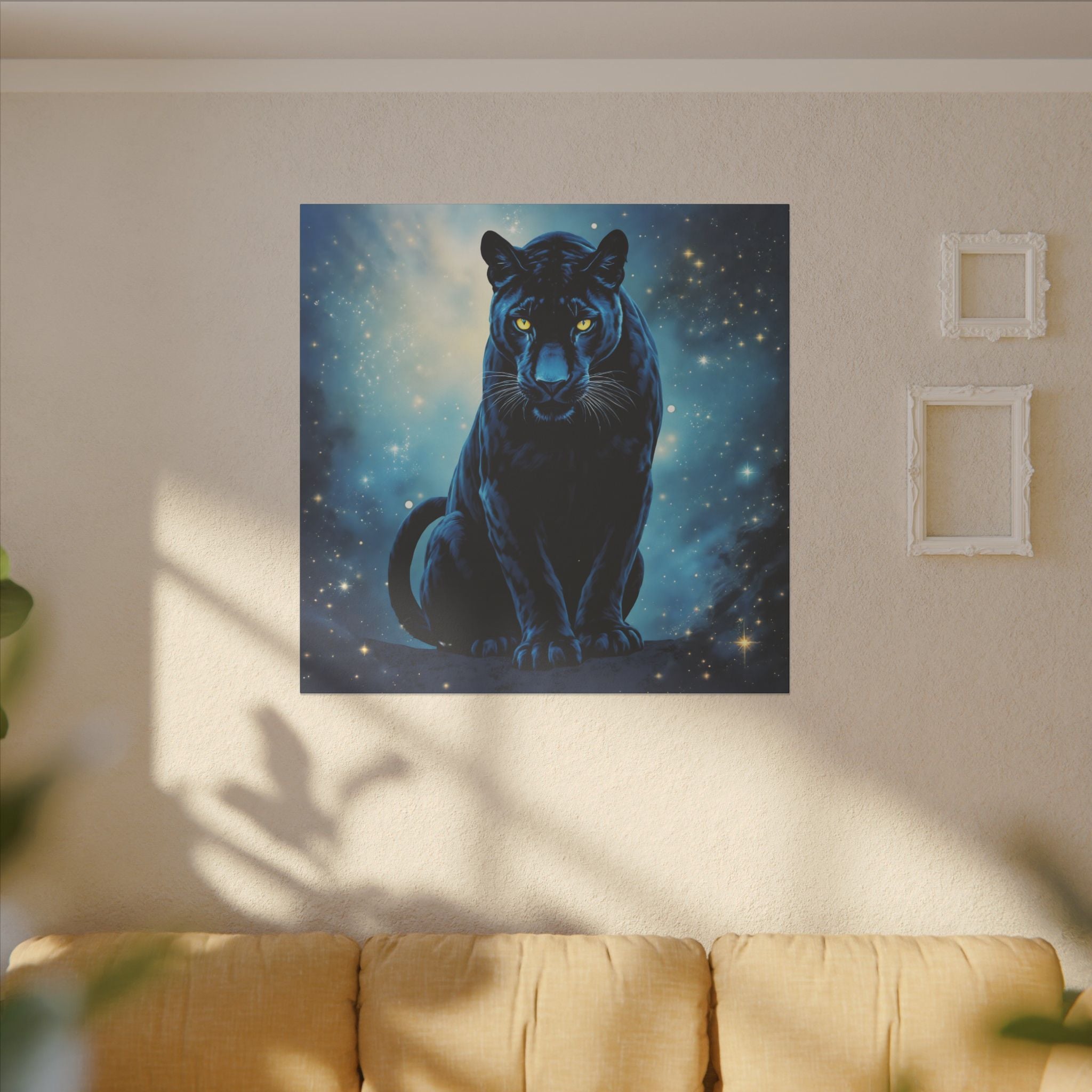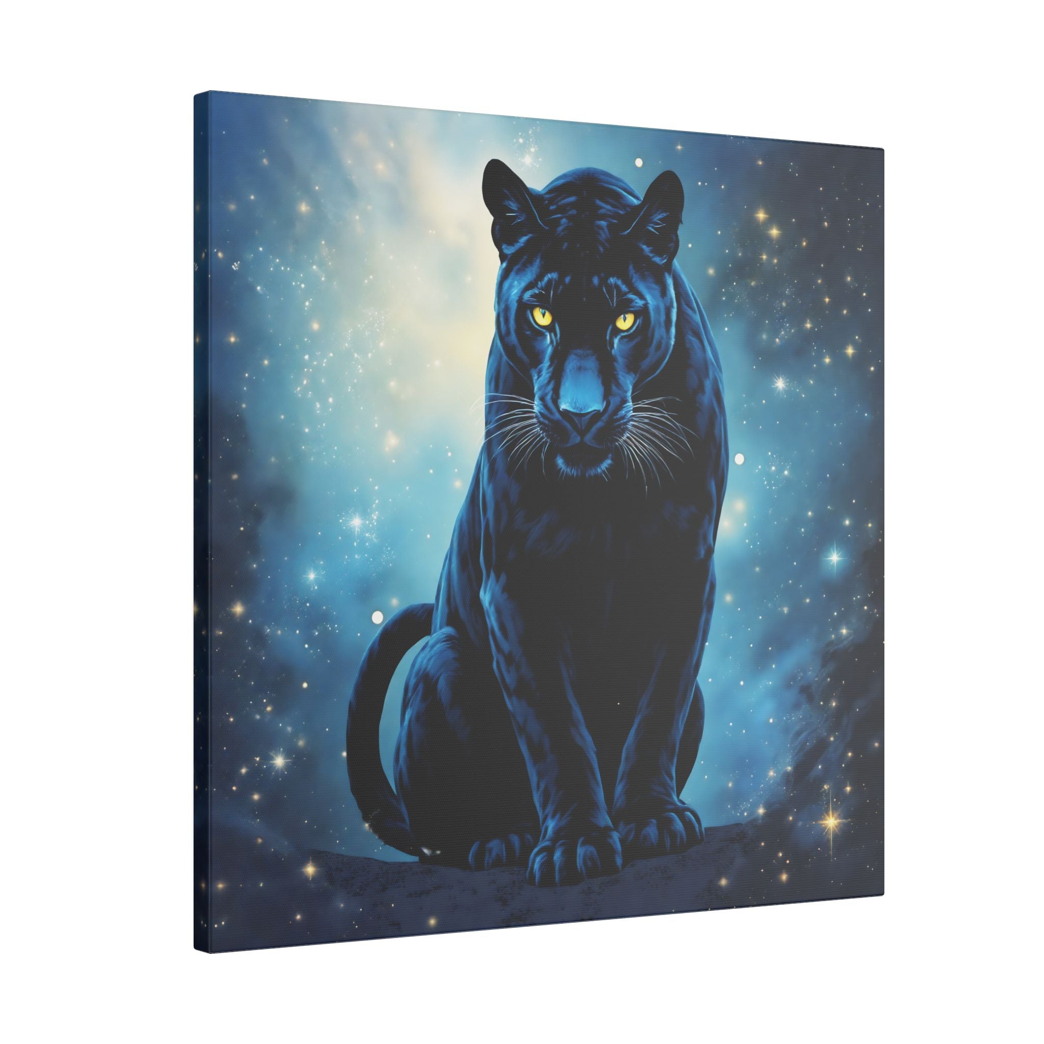 Mit seinem hypnotisierenden Design, das tiefe kosmische Blautöne mit dem auffallenden Blick eines schwarzen Panthers kombiniert, haucht diese wunderschöne bedruckte Leinwand jedem Raum mystische Energie und einen Hauch von Raffinesse ein.