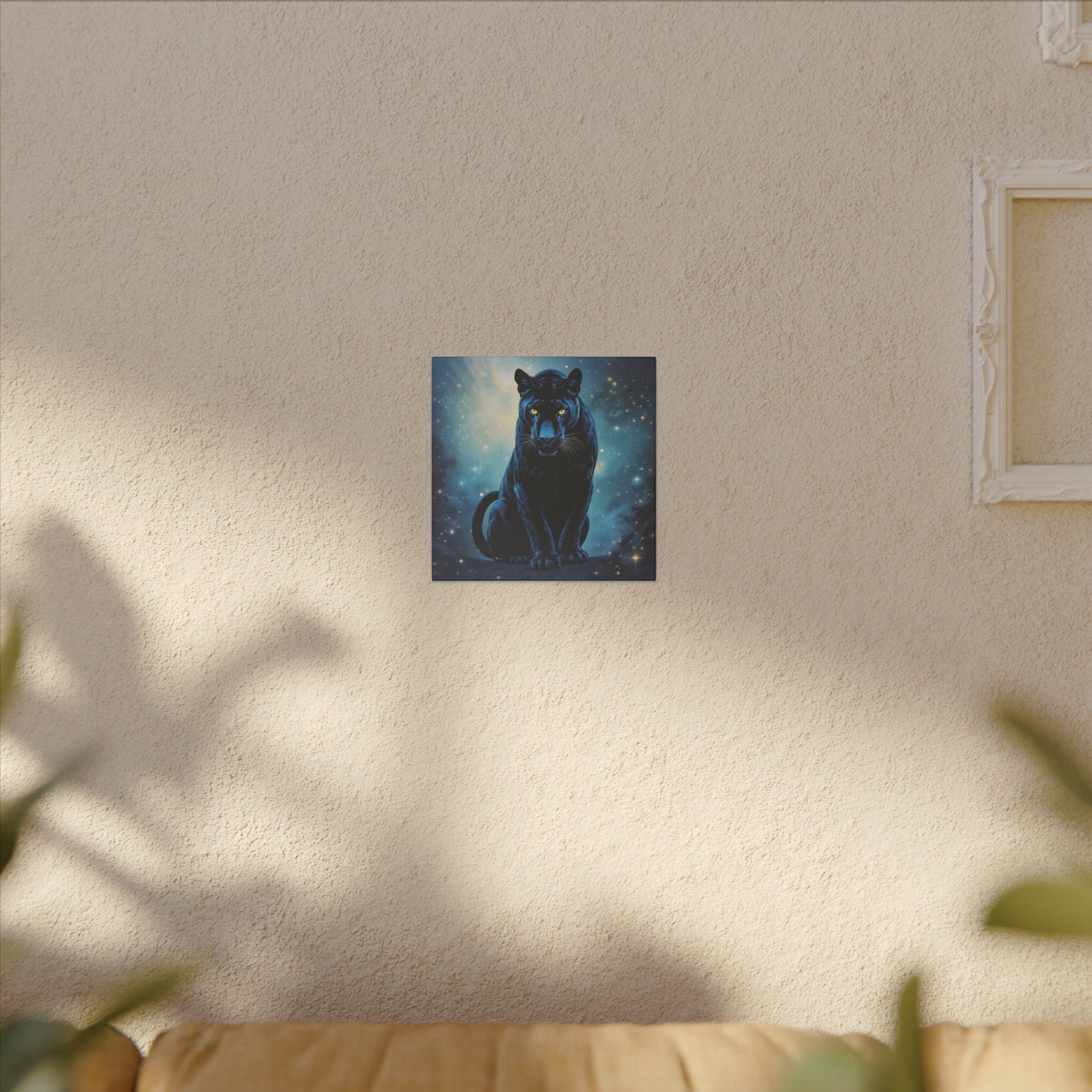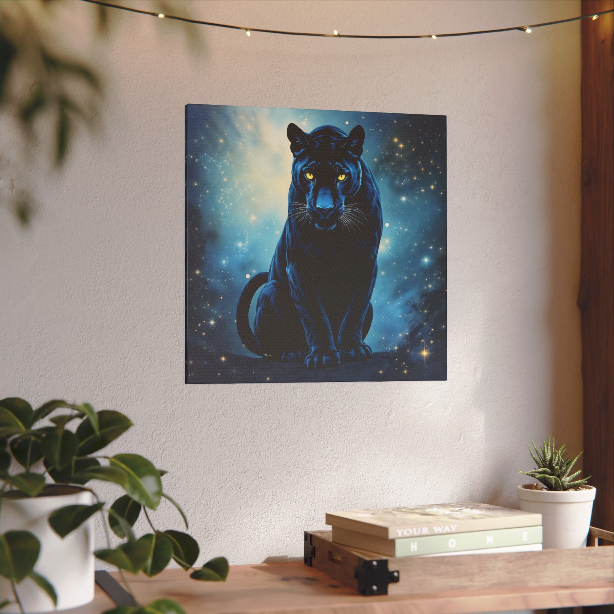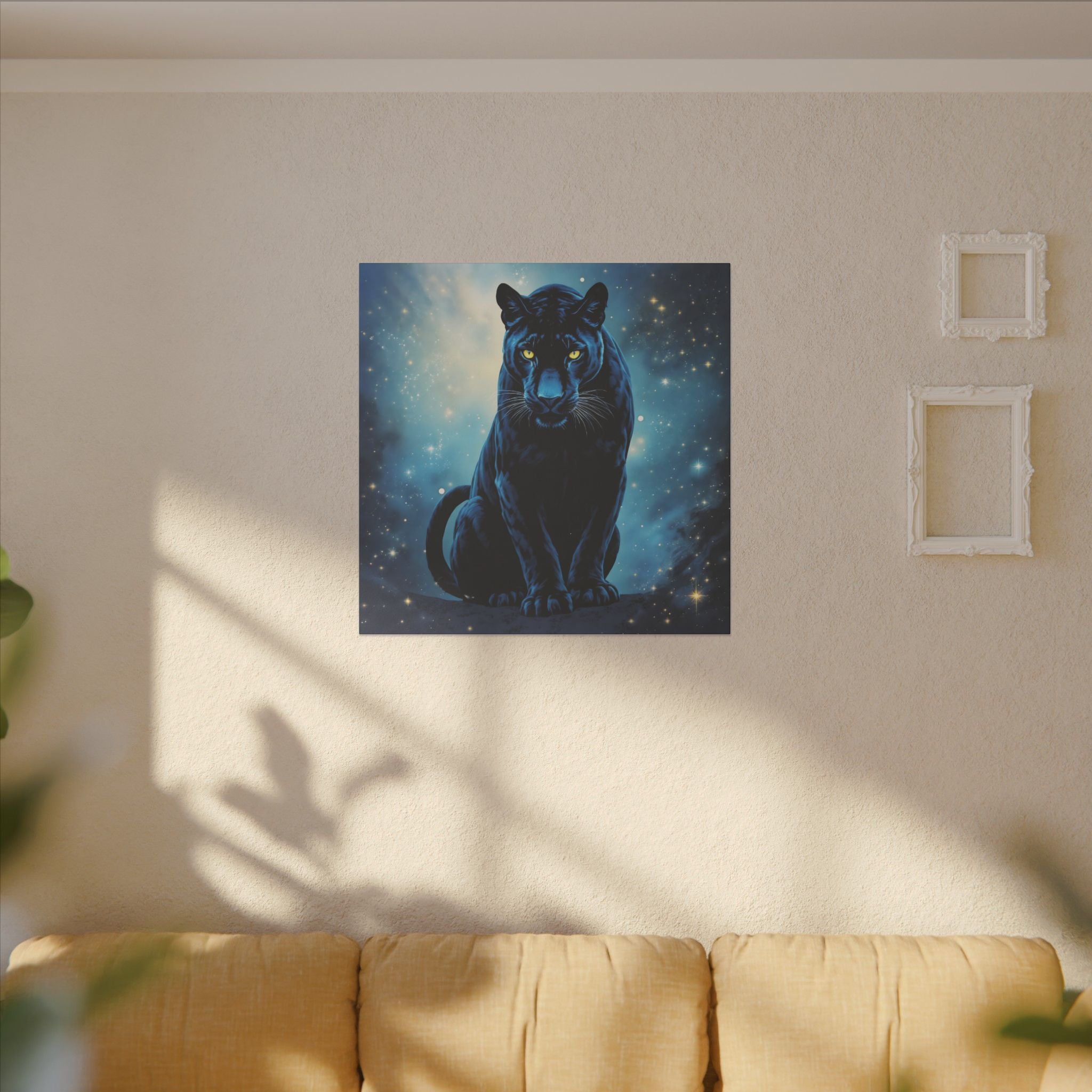 Mit seinem hypnotisierenden Design, das tiefe kosmische Blautöne mit dem auffallenden Blick eines schwarzen Panthers kombiniert, haucht diese wunderschöne bedruckte Leinwand jedem Raum mystische Energie und einen Hauch von Raffinesse ein.