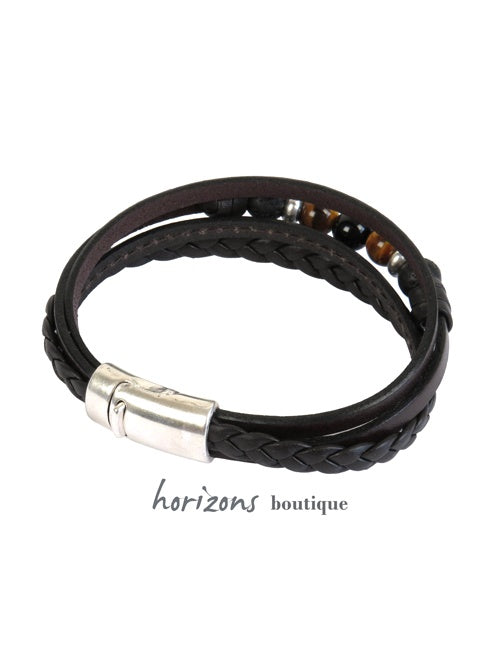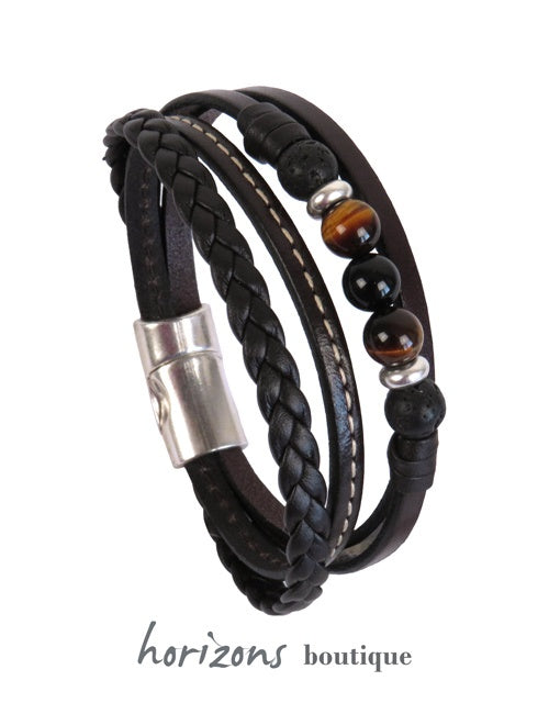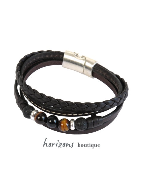 Wunderschönes Manschettenarmband aus einer aussergewöhnlichen Kollektion: vier Windungen aus braunem Leder mit Natursteinen für Männer, die ein originelles männliches Accessoire suchen. Die vier Reihen bestehen aus einfachem Färsenleder, Färsenleder mit Natursteinen, gestepptem Färsenleder und einer geflochtenen Lammlederreihe. Dieses Armband ist auch in Schwarz erhältlich. Der abgerundete Verschluss vervollständigt den einzigartigen Look. Es ist ein Magnetsystem, das sich leicht schliessen lässt.