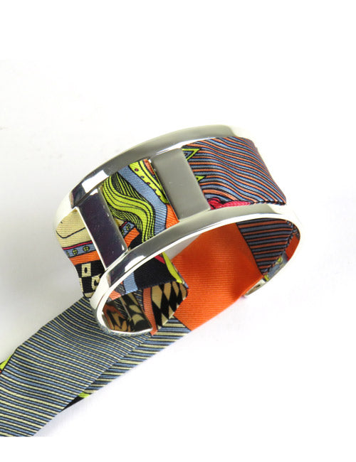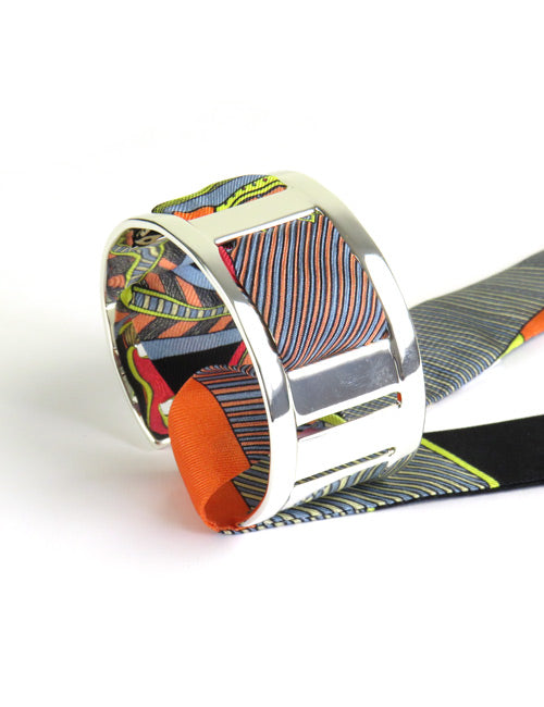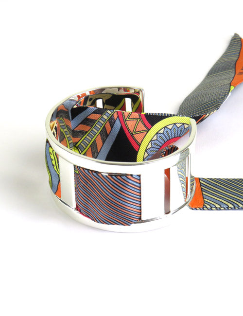 Medium 3 cm Silbermanschette, verkauft ohne Seidenmodell. Kompatibel mit 2 cm Seidenarmbändern. Sie kann auf verschiedene Arten gewebt werden, um die Seide oder das Metall nach Belieben zur Geltung zu bringen. Je nach Lust und Laune kann es auch ohne Seide getragen werden. Auch in Gold erhältlich.