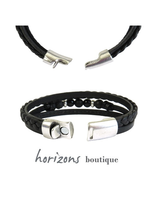 Magnificent cuff bracelet from an exceptional collection: four wraps in black leather with natural stones for men looking for an original male accessory. The four wraps consist of plain cowhide, cowhide with natural stones, topstitched cowhide, and a braided lamb wrap. This bracelet is also available in brown. The rounded clasp completes the unique look. It is a magnetic system that closes easily.