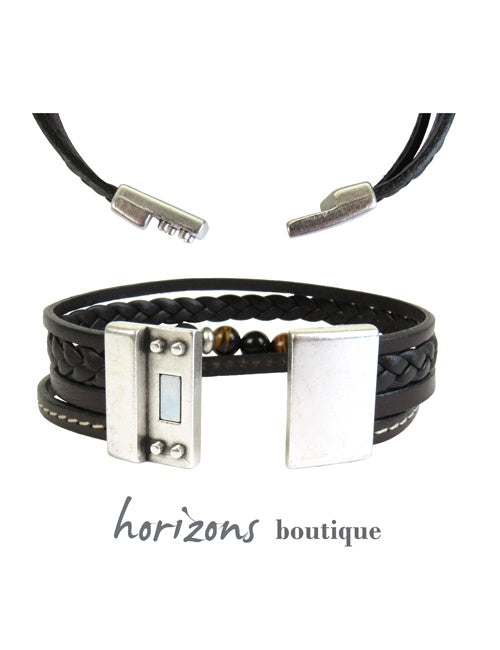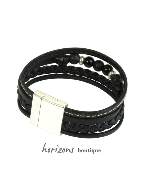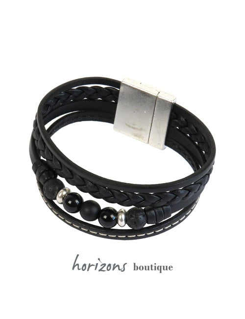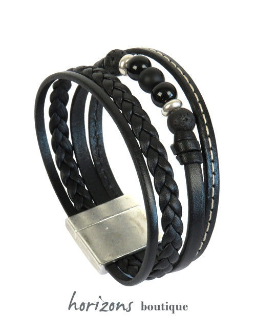 Magnificent cuff bracelet from an exceptional collection: four wraps in black leather with natural stones for men looking for an original masculine accessory. The four wraps consist of plain cowhide, cowhide with natural stones, topstitched cowhide, and a braided lamb wrap. This bracelet is also available in brown. The trendy rectangular clasp completes the unique look. It is a magnetic system that closes easily.