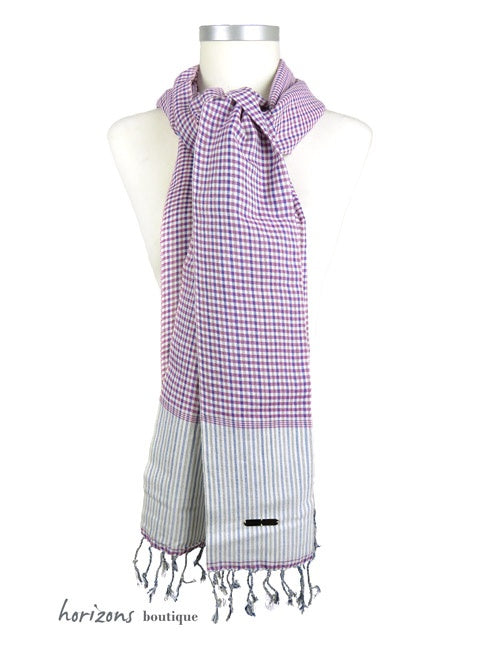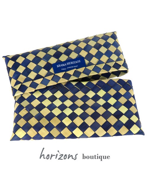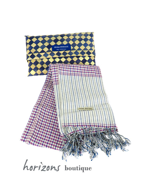 Premium cotton Krama with a check print and woven fringes. This Krama comes in its hand-woven palm leaf case.