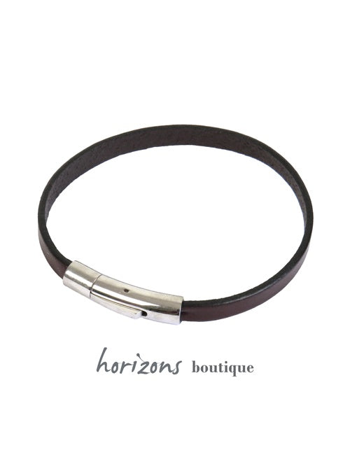 Bracelet look sport à simple tour en cuir marron pour les hommes à la recherche de classe et d'originalité. Ce bracelet existe également en noir et en cognac, ainsi qu'en version 3 tours. Le fermoir cylindrique fin est un système qui se clique en place et se ferme facilement. Il s'ouvre en appuyant sur la petite languette.