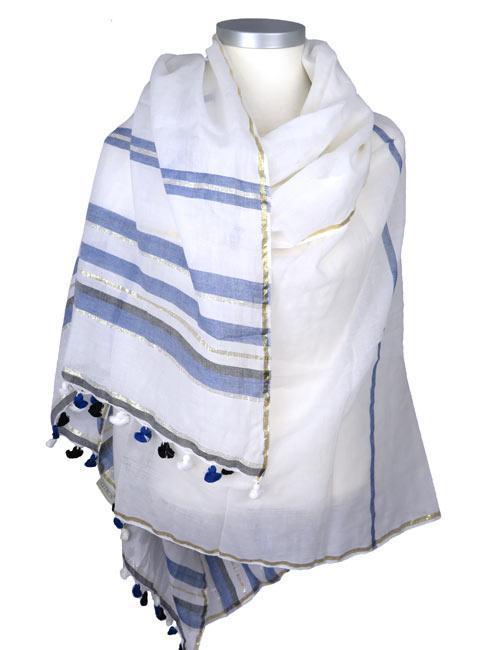 Très douce au toucher, cette écharpe légère finement tissée porte de longues rayures bleues et de lurex doré. Alliant chic et élégance, ornée sur le pourtour de pompons enjoués en bleu et blanc, cette écharpe est parfaite pour l'été.
